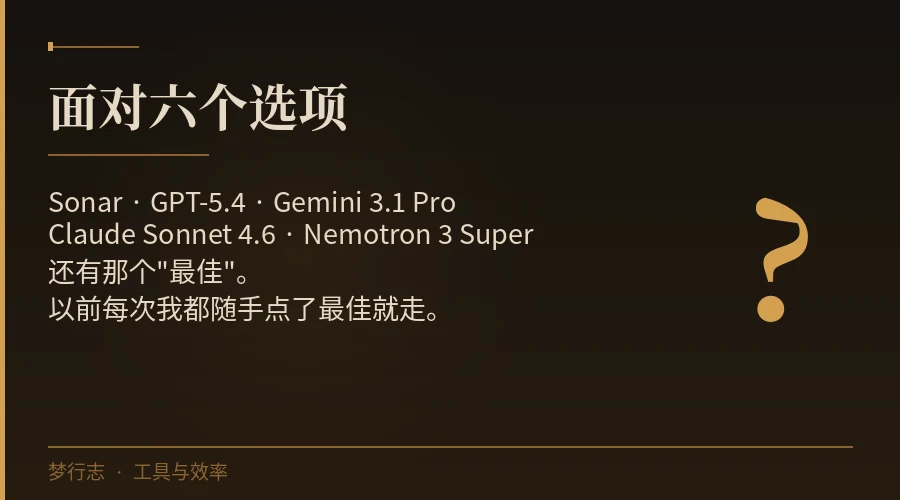 这个界面我见过不止一次了。Sonar、GPT-5.4、Gemini 3.1 Pro、Claude Sonnet 4.6、Nemotron 3 Super,还有最上面那个"最佳——选择可用的最佳模型"。每次我都随手点了"最佳",然后继续问我的问题。