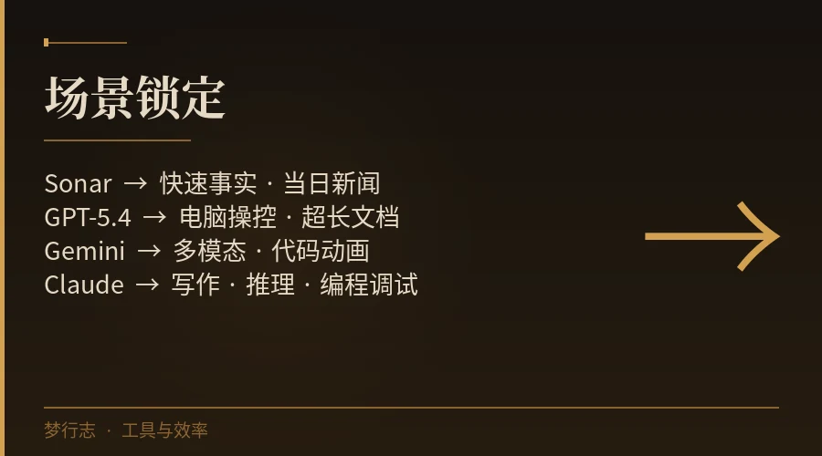 最开始我有一个朴素的判断:GPT 最强,选 GPT 就行。这个判断是错的。不是 GPT 最强,而是每个模型在不同场景下各有胜场。就像你不会因为"SUV 最万能"就放弃摩托车骑山路一样。
